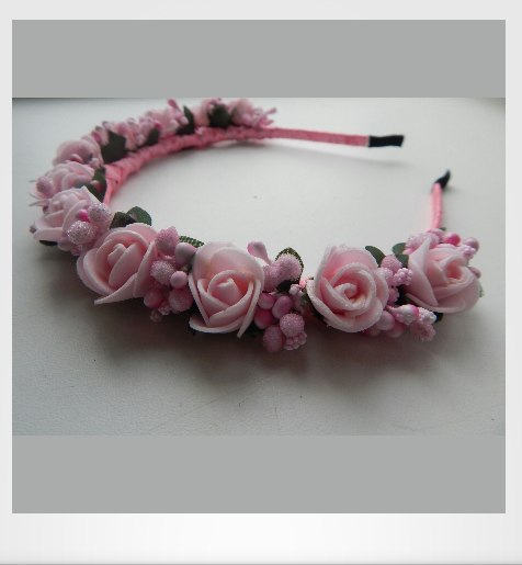 Used materials – flowers of soft material – foamiran, stamens, artificial wire, basis for headbands, satin ribbons, cloth, threads, scotch tape, glue.