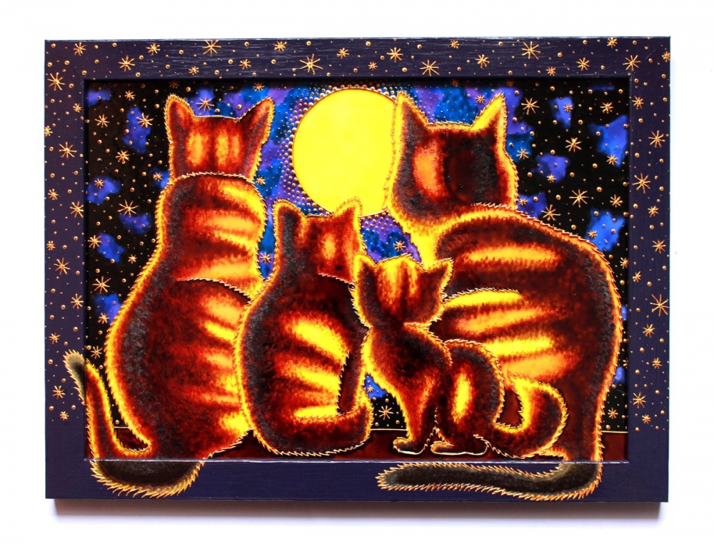 In unserem Web-Shop können Sie ein handgefertigtes Glasfensterbild “Kater beim Mondschein” kaufen.