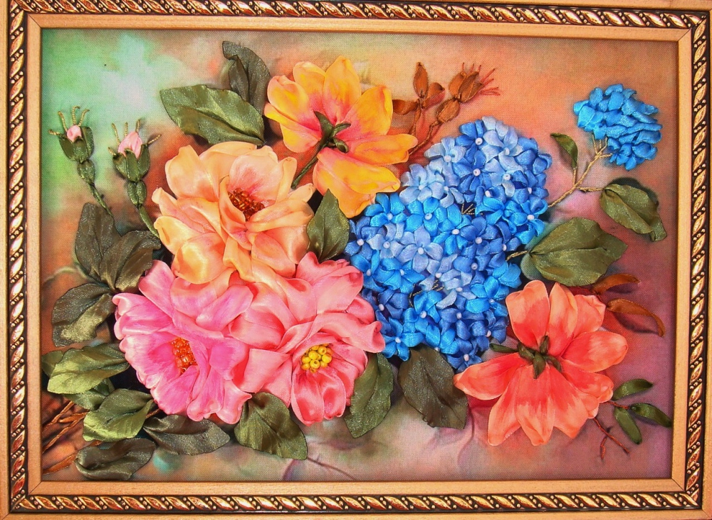 Stickerei mit Atlasbändern, Moulines, Glasperlen auf dem Print; Holzrahmen.