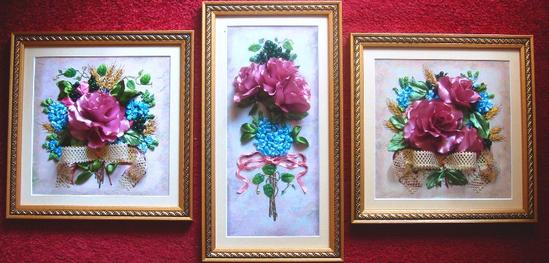 Stickerei mit Atlasbändern, Glasperlen und anderen Schmuckelementen.
