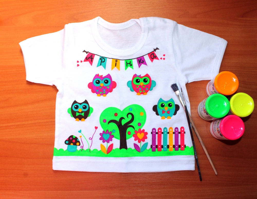 Материалы – ткань (100 % хлопок), профессиональные краски (яркие цвета — флуоресцентные).