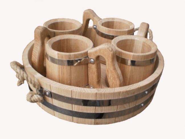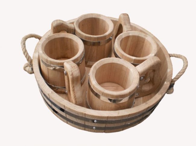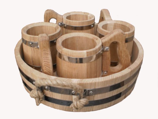 Набор состоит из четырех крепких кружек емкостью 0,5 л и круглого дубового подноса.
