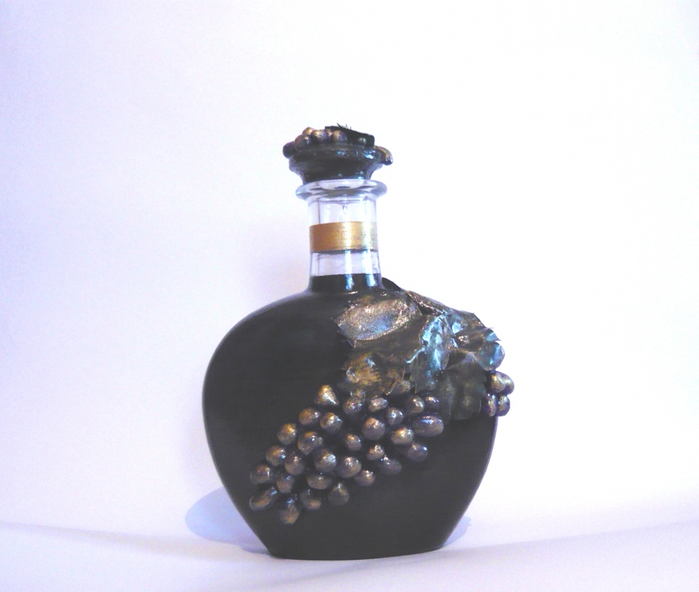 Material – glass oval bottle. For decoration of the bottle cloth, self-cooling mass, gouache and varnish were used.