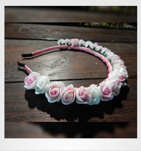 Used materials – flowers of soft material – foamiran, wire, basis for headbands, satin ribbons, cloth, threads, scotch tape, glue.