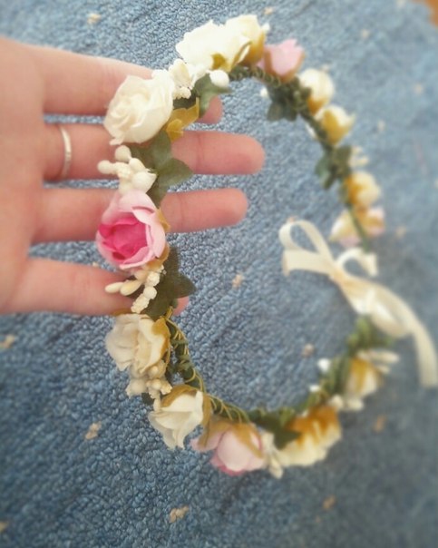 Used materials – flowers of soft material – foamiran, wire, basis for headbands, satin ribbons, cloth, threads, scotch tape, glue.