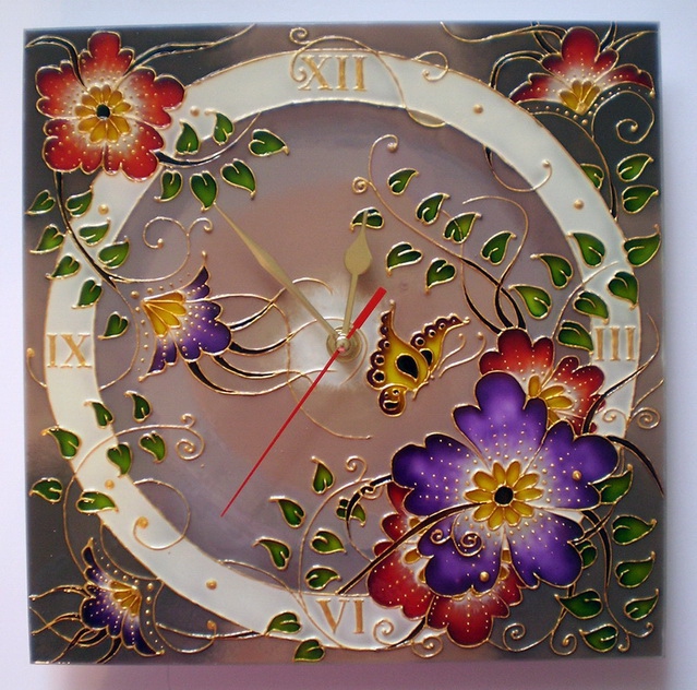 Materials – glass with worked rims, professional stained glass paints, silent quartz clock work.