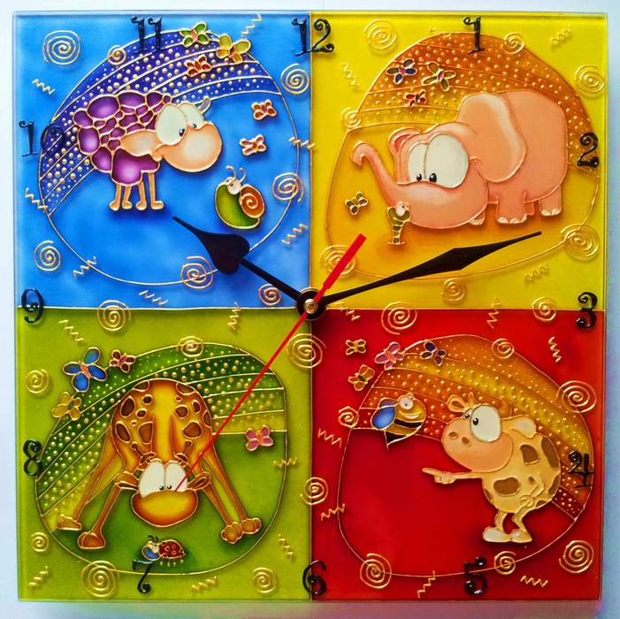 Materials – glass with worked rims, professional stained glass colours, clock work.