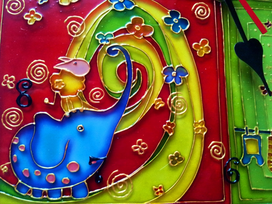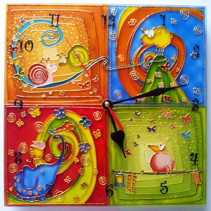 Materials – glass with worked rims, professional stained glass colours, clock work.